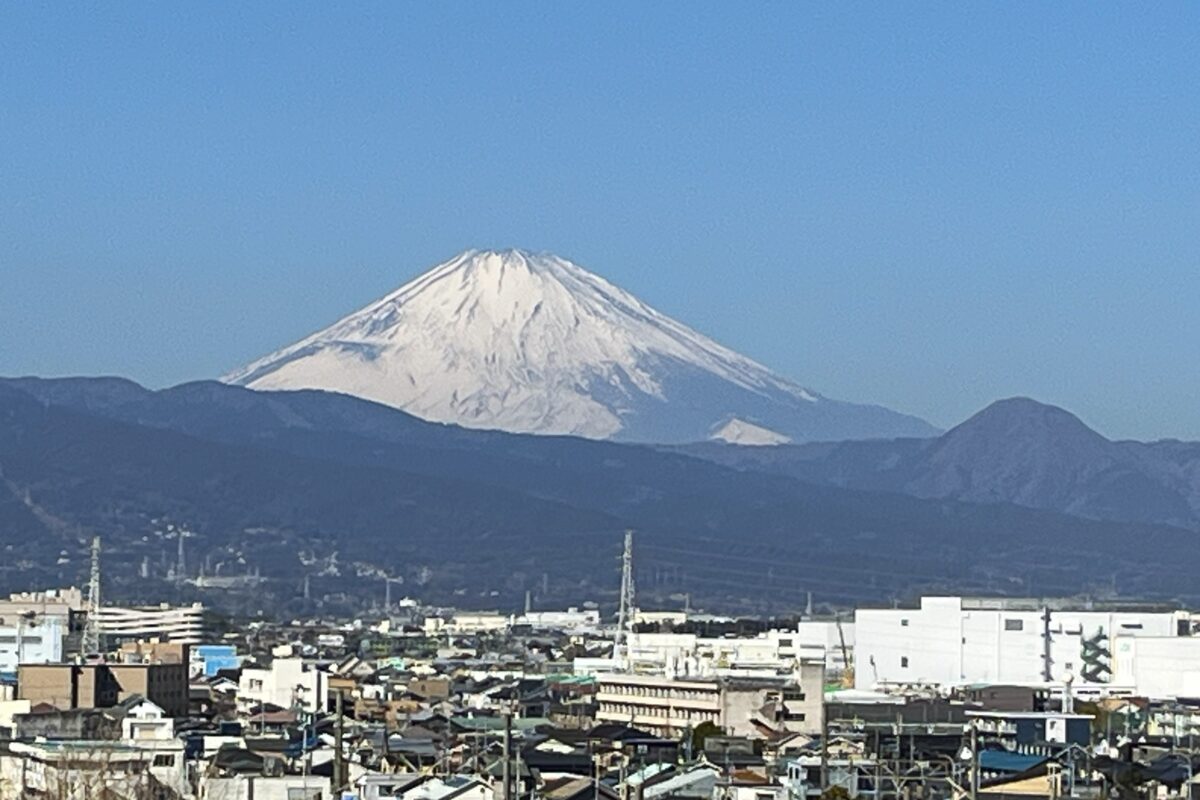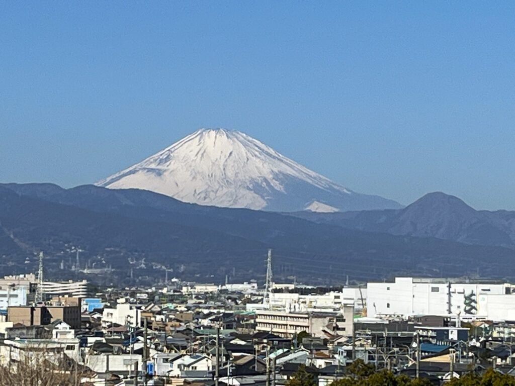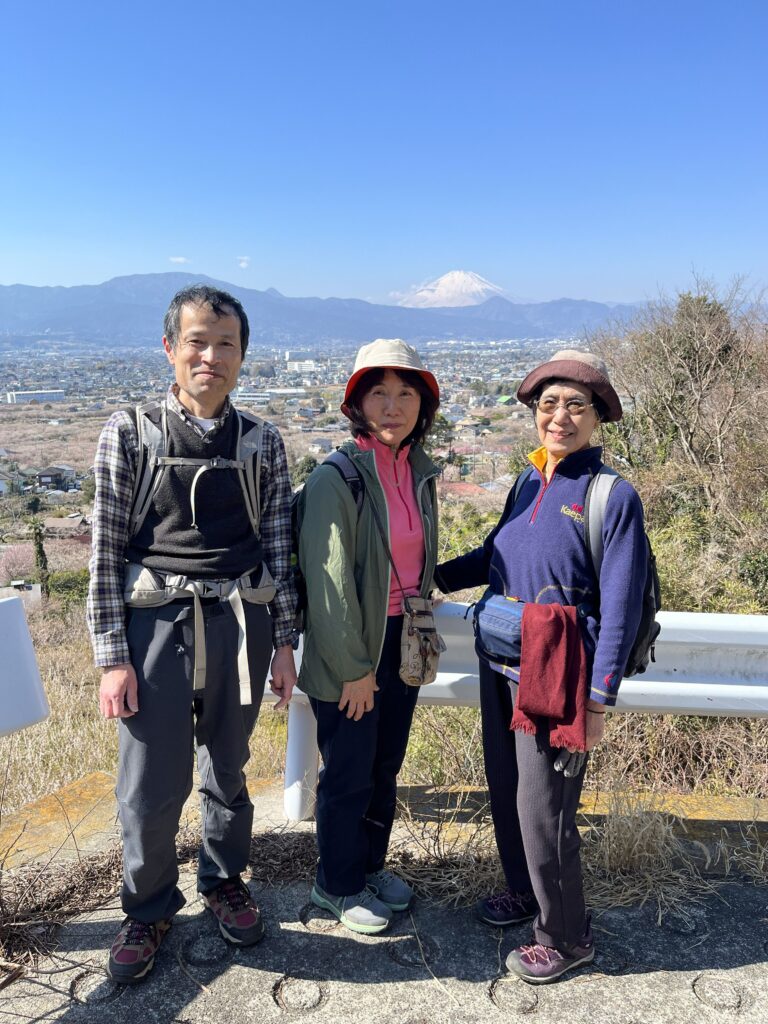 駅前では登山者らしい人たちも多かった。登山口の坂を登って行くと、いきなり富士山が大きく見えた。参加の皆さんも景色の良さに感激したようだ。しばらく歩いていると、後ろからウォーキングの団体が来て、競歩かのように追い抜かれてしまった。年齢層は我々に近いのだが、このように登山を楽しむ方もいるのかと皆で話をした。