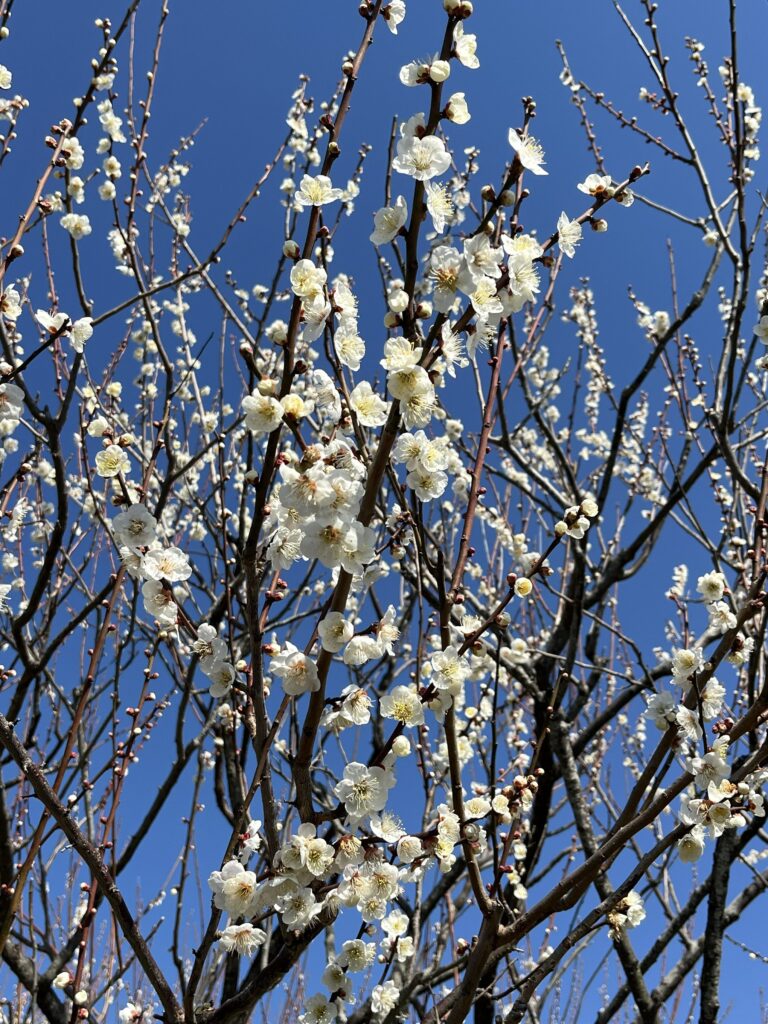 梅林ではやはり白い梅のピークは少し過ぎた感じであったが、紅のしだれ梅はきれいに咲いていた。売店の近くの梅林の休憩場所で昼休憩とした。梅林を間近に花見をしながら休憩できて、良いひと時となった。