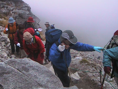 視覚障害者のHさんはロープで確保しながら下ってもらいました。 |
