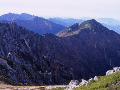 三沢岳(右手)と中央アルプスの主脈(一番左が空木岳) |