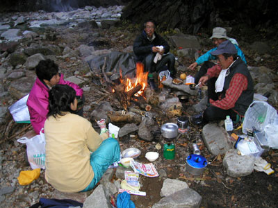 釜ノ沢出合で、別パーティーとたき火を囲む。 |