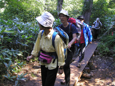 大きな石が滑りやすいが、サポートをしながら歩く。 |