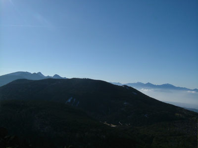 | 南八ヶ岳(左)と南アルプス北部の山々。手前は縞枯山 |