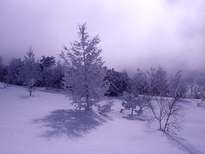 | 雪原を歩いていると、薄日が差し始めた。樹氷が美しい。 |