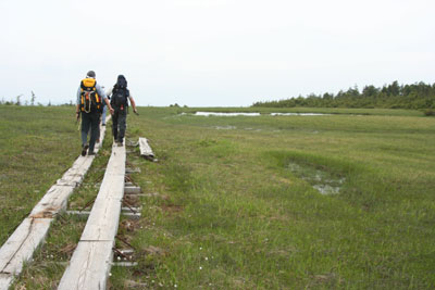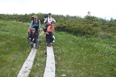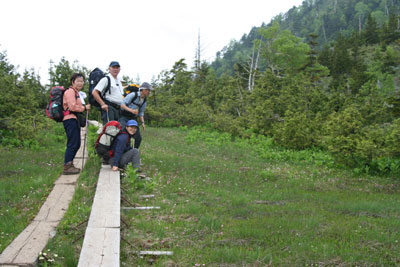 | 広い湿原の向こうには、雪を抱いた会津駒がうっすらと見えた。 |
