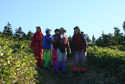 | 日の出後の登山道をオヤマ沢田代に向けて登る。 |