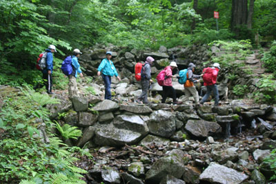 緑の中を歩き、避難小屋に到着した別動隊。 |