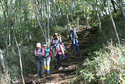 ザックのひもに掴まって下る視覚障害者のNさん。 |