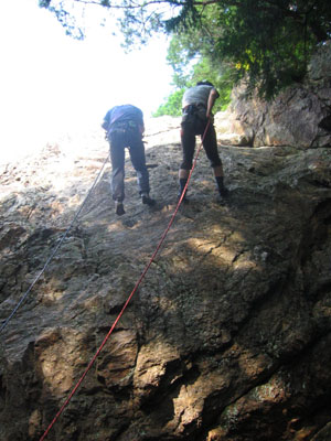 懸垂下降の練習をするTさんと指導するMYさん。 |