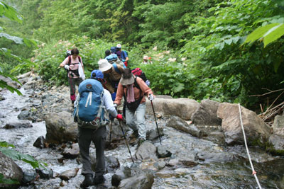 2日目、早池峰山に向けて、コメガモリ沢を渡る。 |