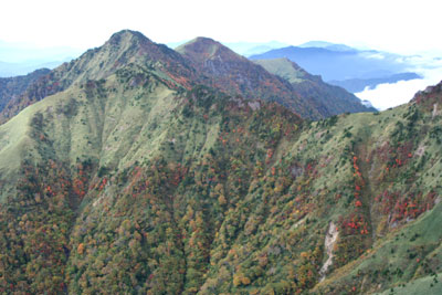 紅葉の美しい男山から瓶ヶ森山頂の女山を目指す。 |