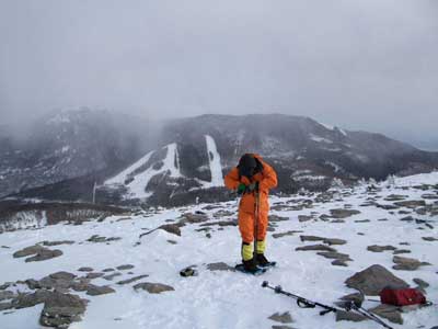 湯ノ丸山を正面に見ながら、ショートスキーで滑るYOさん。 |