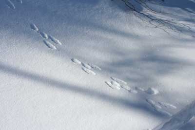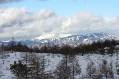 | 湯ノ丸山を見上げながら雪原を歩く。 |