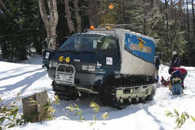 | タクシーを降りて、雪上車の走る林道を歩く。 |