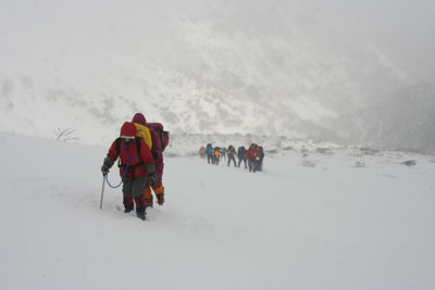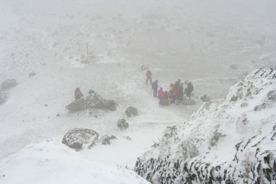 | 霧にまかれ、時折地吹雪となる中を登る。 |