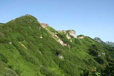 遠くに霞む鹿島槍(奥の双耳峰)と爺ヶ岳(その手前) |