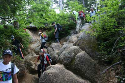 別動隊も視覚障害者の人たちをサポートしながら慎重に下る。 |