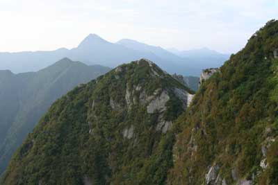 鋸岳第一高点とその向こうに、うっすらと槍穂高連峰 |