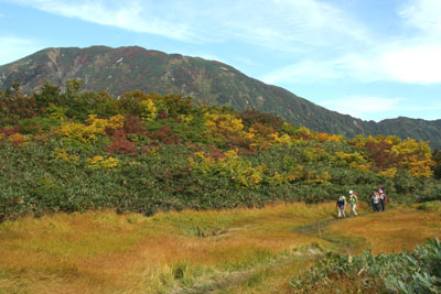 中ノ岳を背に、草紅葉の草原を歩く。この付近が、生姜畑。 |