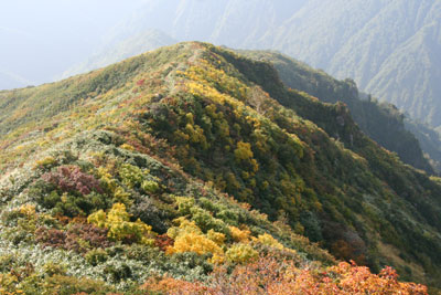 中ノ岳山腹の紅葉と下山する日向山方面 |