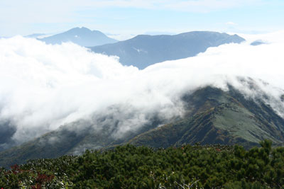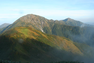 兎岳の下りで霧が晴れて、中ノ岳と越後駒ヶ岳が見えた。 |