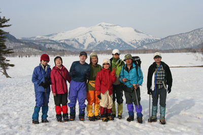 燧ヶ岳を背に、尾瀬沼の上の雪原を歩く。 |
