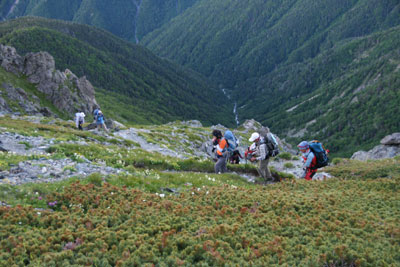 赤石岳東面のお花畑に入っていく。 |