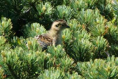ハイマツから顔を出したライチョウの雛 |