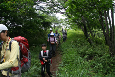 | 緑が鮮やかで美しい。 | 大久保のコルに駆け上がって来たK君。 |