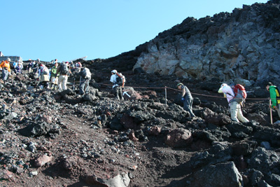 | 山頂の鳥居まであと少し。 | 空気が薄い中をがんばって山頂を目指す。 |