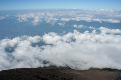 | 雨が止み、霧の中をY君を先頭に登る。 | 霧が晴れて青空と雲海が広がった。下の建物は六合目の雲海荘。 |