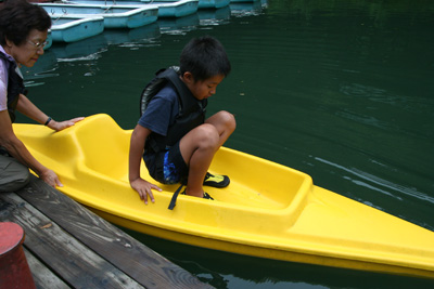 | 乗り方をマスターしたS君は、湖にこぎ出していった。 | 次は、すね毛のKRさんの乗船です。 |