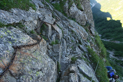 | ぶらぶらの鎖に掴まって細いハシゴを渡る。 | まだ続く鎖場。 |
