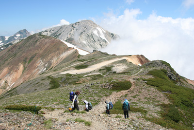 | 3日目の朝、白馬岳山頂にて。Hさん、Uさん、Aさん。 | Nさんを先頭に広いお花畑を背に下る。 |