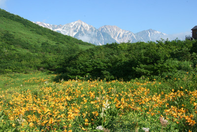 八方尾根、鎌池のニッコウキスゲのお花畑と白馬三山 |