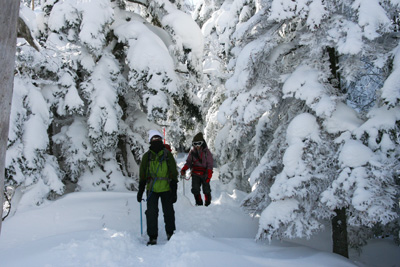 | 2mほど積もった雪道を歩く。 | すばらしい青空の下を歩く。 |