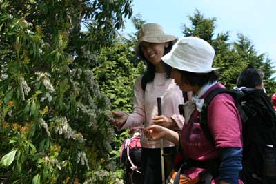 アセビの花や葉にさわってみるMさん。(やらせだよ〜) |