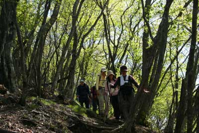道は厳しいが周囲の新緑は最高に美しい。 |