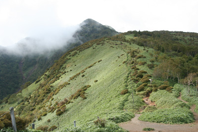 | 丸山から急な道を下る。 | クマザサの草原を下る。 |