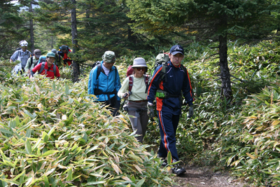 | 今回のコースはどこもクマザサが深かった。 | 大河原ヒュッテと亀甲池方面の分岐。 |