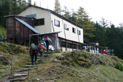 | 山頂直下の岩場からふもとを見下ろす。 | ランプの宿、蓼科山頂ヒュッテ。 |