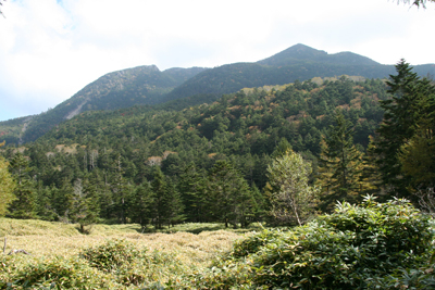 | 蓼科山の登りから見た縞枯れ現象を見せる前掛山 | 遠く白馬三山を望む |