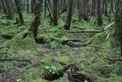 | 縞枯山山頂付近の枯れ木帯 | 一面シダで被われた林床 |