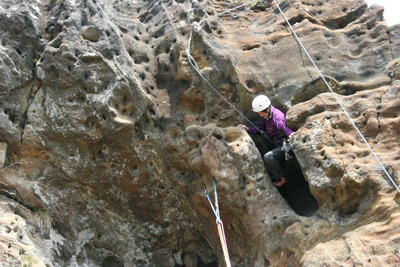 | ロープにぶら下がって下降するKさん。 | 子不知南面の下部を登るSさん。 |