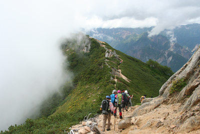 | 霧が晴れて、歩いてきた縦走路が見える。 | 長いトラバースが終わると、大天荘に到着する。 |