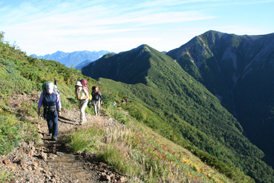 | 青空の下、赤岩岳をトラバースする。 | トラバース道には、岩場もある。 |