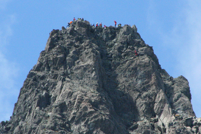 | 槍ヶ岳山頂に立つ人たちと、北鎌尾根から 最後の穂先を目指す2人(山頂直下と右側にいる)。 |