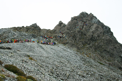 霧の晴れ間に一瞬姿を見せた槍ヶ岳。山頂のスペースが 空くのを待つ人たちの列が見える。 |