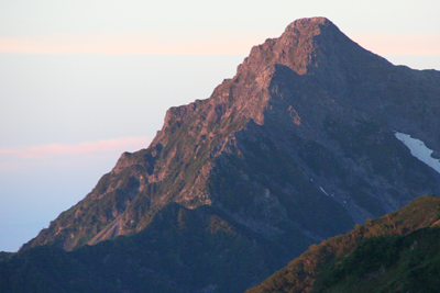 | 朝日に染まる前穂高岳と北尾根(手前に伸びた尾根) | 早朝の立山、剣岳、針木岳方面 |