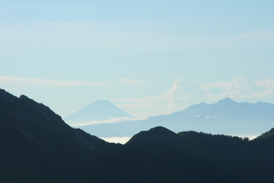 | 富士山と甲斐駒ヶ岳 | 大天井ヒュッテと遠くに燕山荘が見える、右上は大天井岳 |